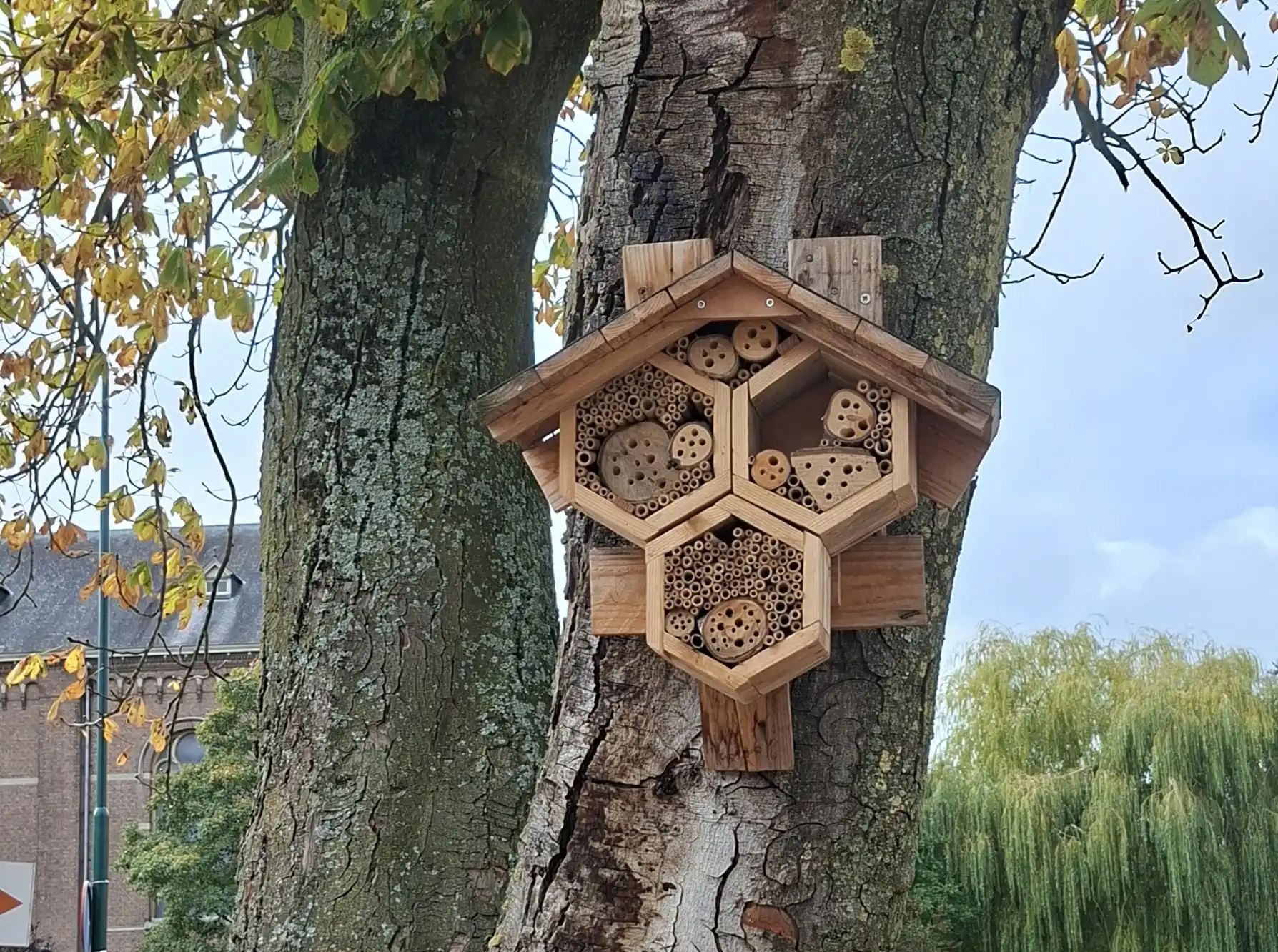 In één van de bomen hangt een insectenhotel, waar bijen, vlinders en andere kleine diertjes hun thuis vinden. Zo leren kinderen spelenderwijs hoe belangrijk de natuur is – gewoon door omhoog te kijken tijdens het spelen.