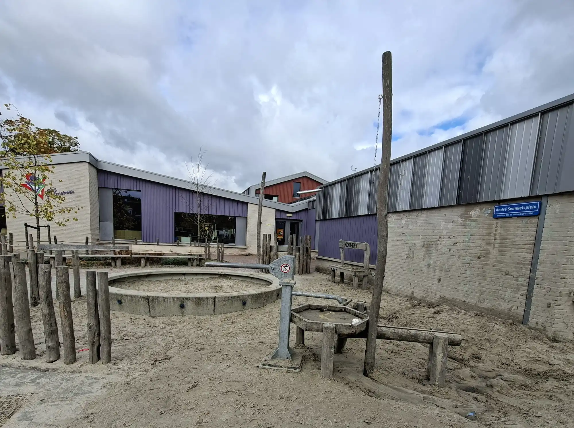 Het hoogtepunt van het plein is de waterspeelplaats en de speelheuvel met kruipbuis en glijbaan – dé plek waar fantasie en beweging samenkomen. Bij de waterspeelplaats wordt volop gekliederd, gebouwd en geëxperimenteerd. Zo ontdekken ze spelenderwijs hoe water stroomt en hoe je samen iets kunt creëren, zonder dat het voelt als leren, gewoon met hun handen in het water en een grote glimlach op hun gezicht.