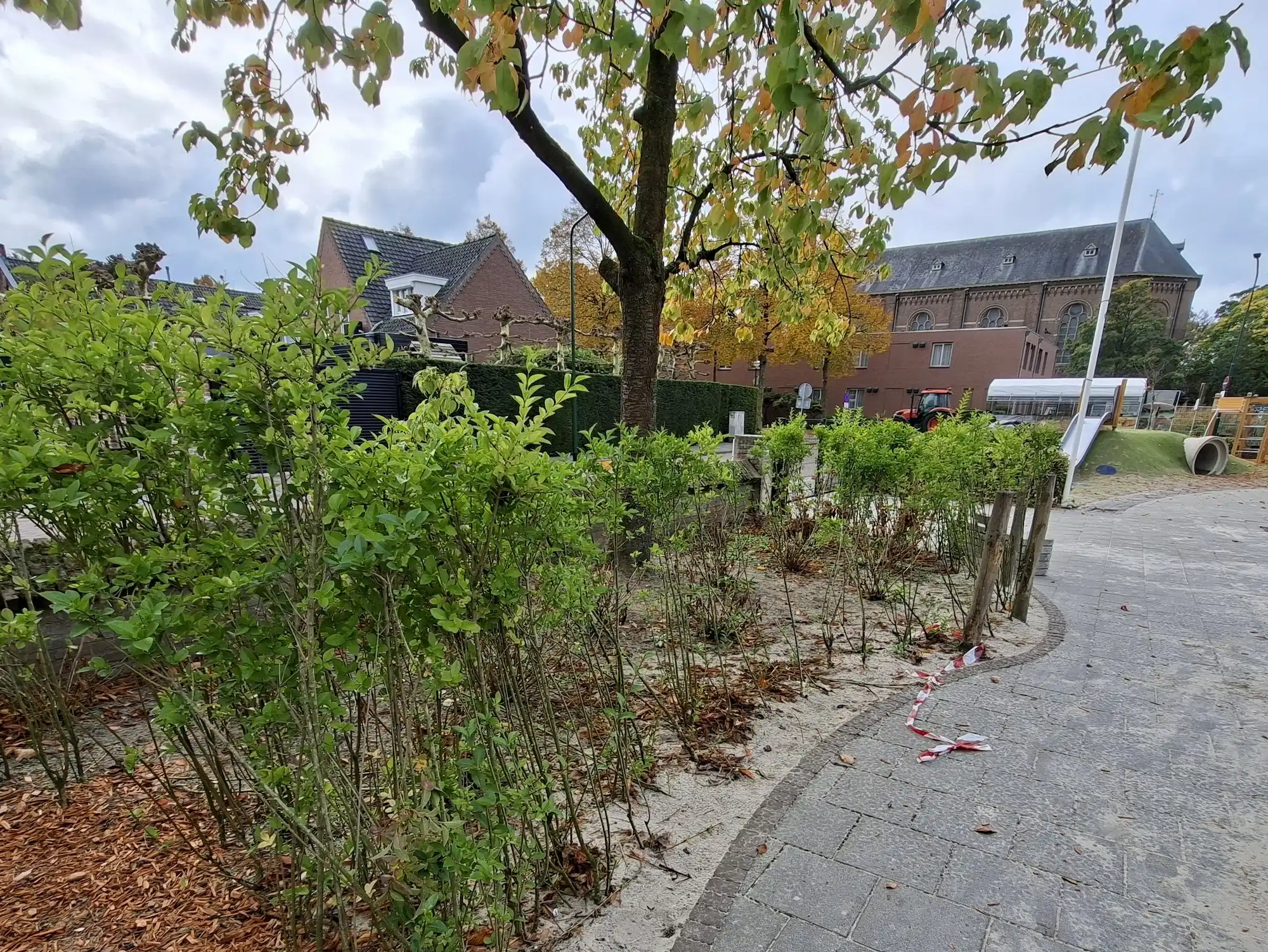 Over het plein slingert een verkeersroute die rond een groene rotonde loopt – perfect voor fietsers, steppers en spelletjes onderweg. Tussen de plantenvakken met verschillende soorten beplanting groeien en bloeien planten het hele jaar door, en de vele bomen en struiken zorgen niet alleen voor sfeer en schaduw, maar ook voor spannende sluippaadjes om doorheen te kruipen en te verstoppen.