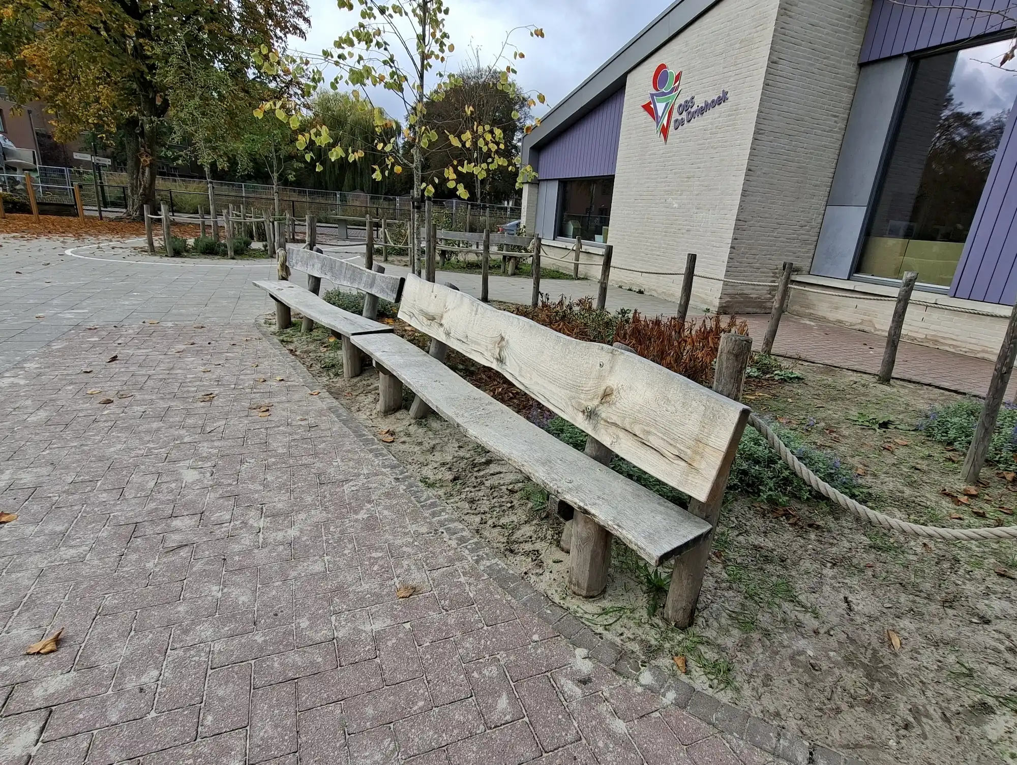 Verspreid over het plein staan bankjes waar kinderen kunnen bijkomen van het spelen, ouders elkaar ontmoeten en leerkrachten genieten van de levendige, groene omgeving.
