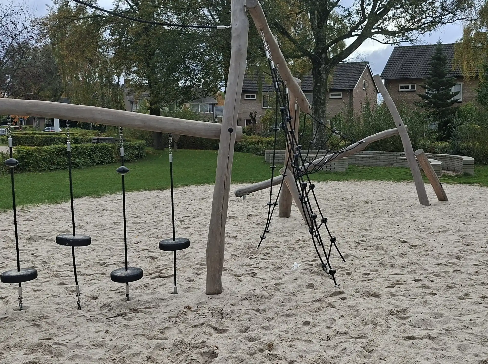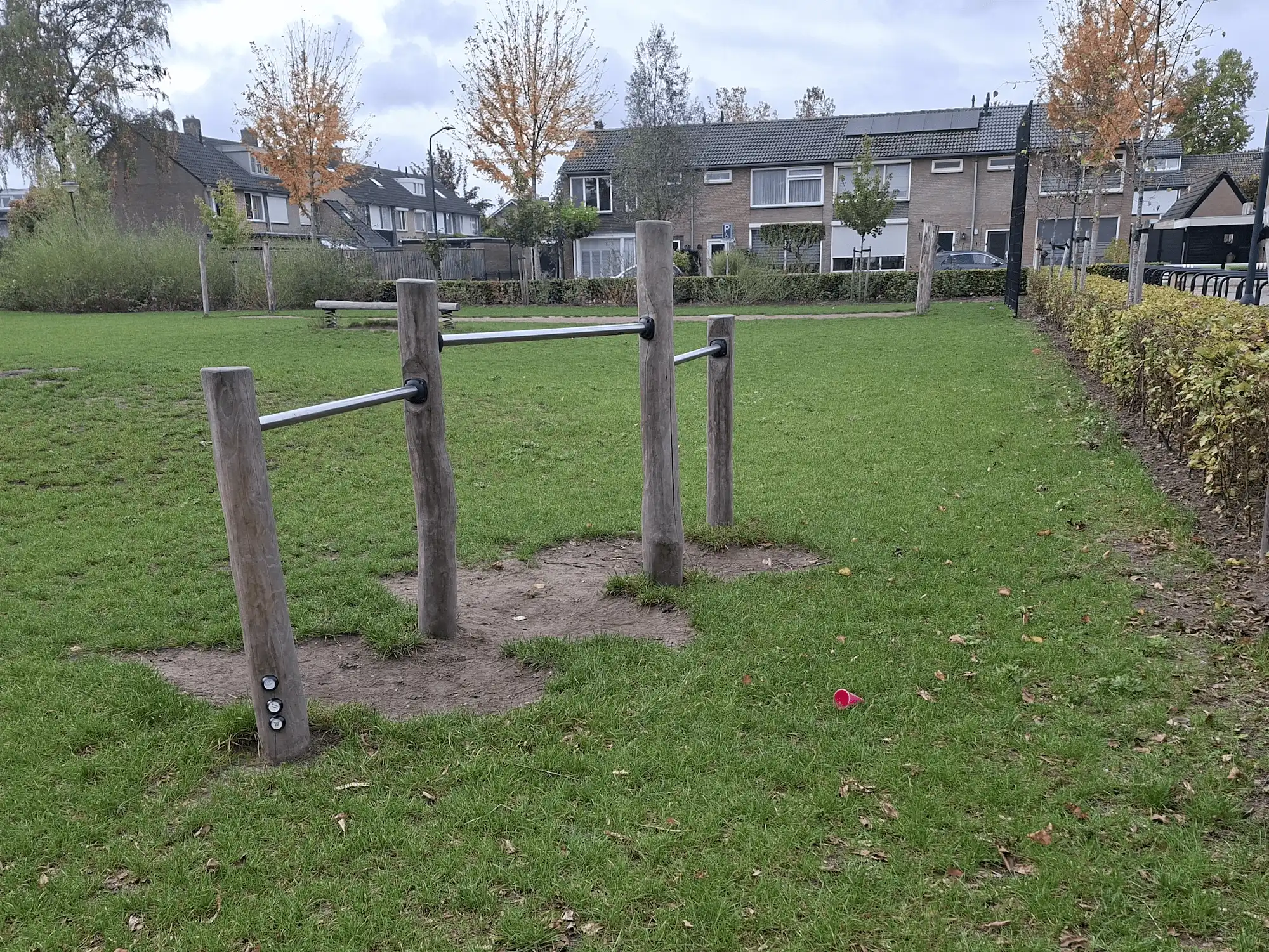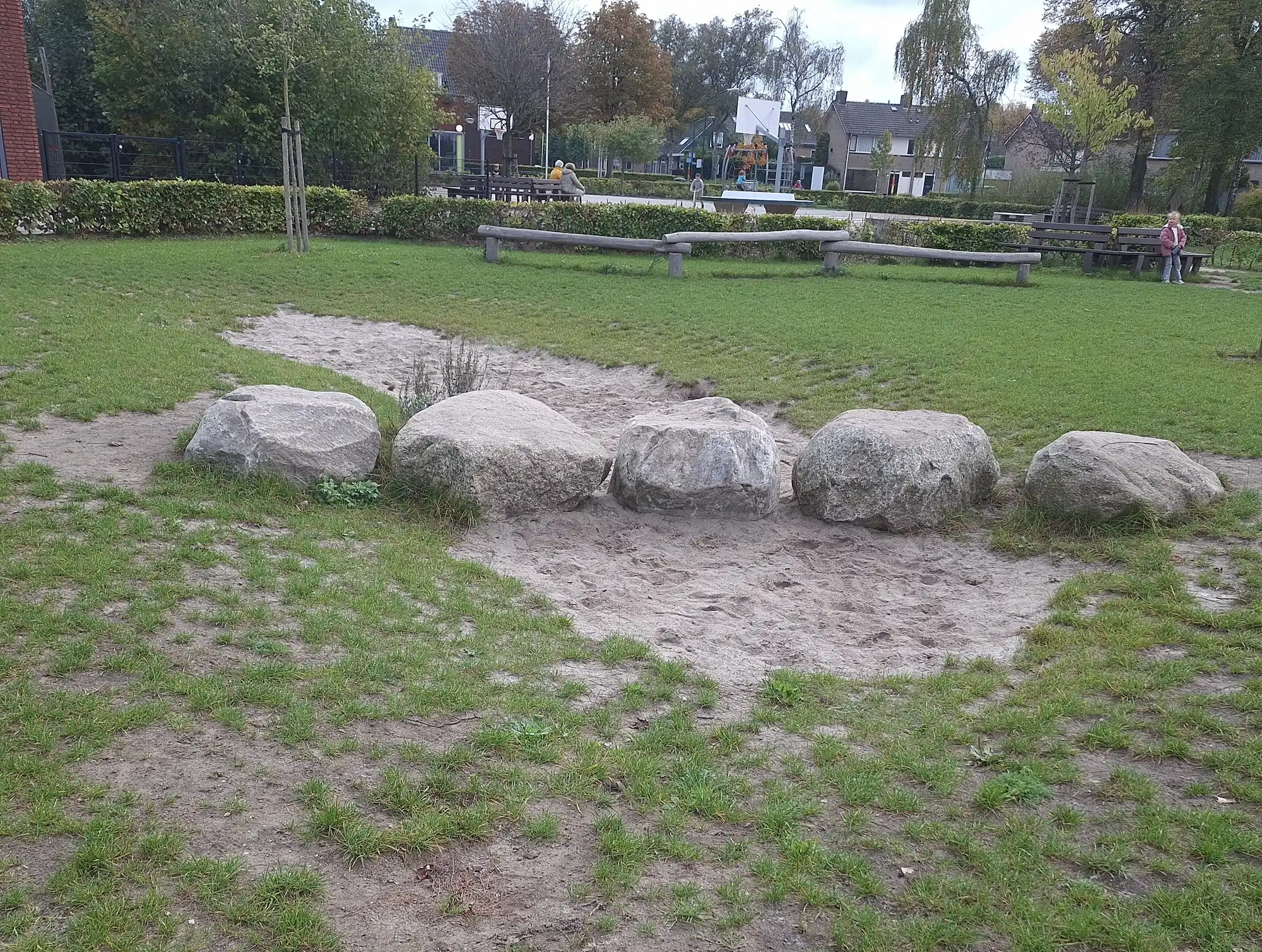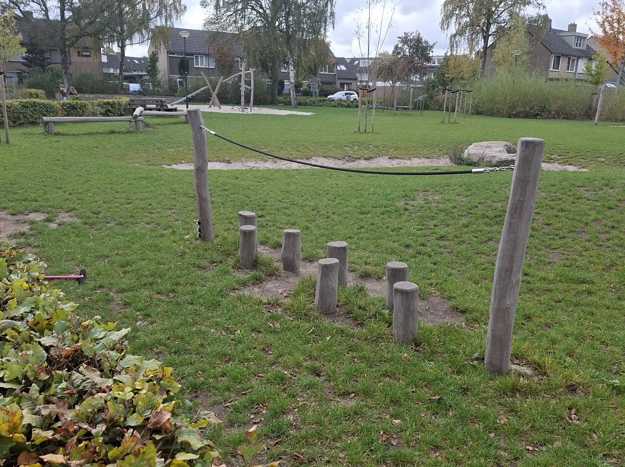 Op het grasveld is van alles te beleven. Er zijn verschillende speeltoestellen voor echte avonturiers: een klimtoestel om te klauteren en te zwaaien, een duikelrek, stapstenen, evenwichtsbalken en paaltjes die uitdagen om te balanceren en te bewegen. Tussen de struiken met sluippaadjes ontstaan de leukste spelletjes en geheime routes.