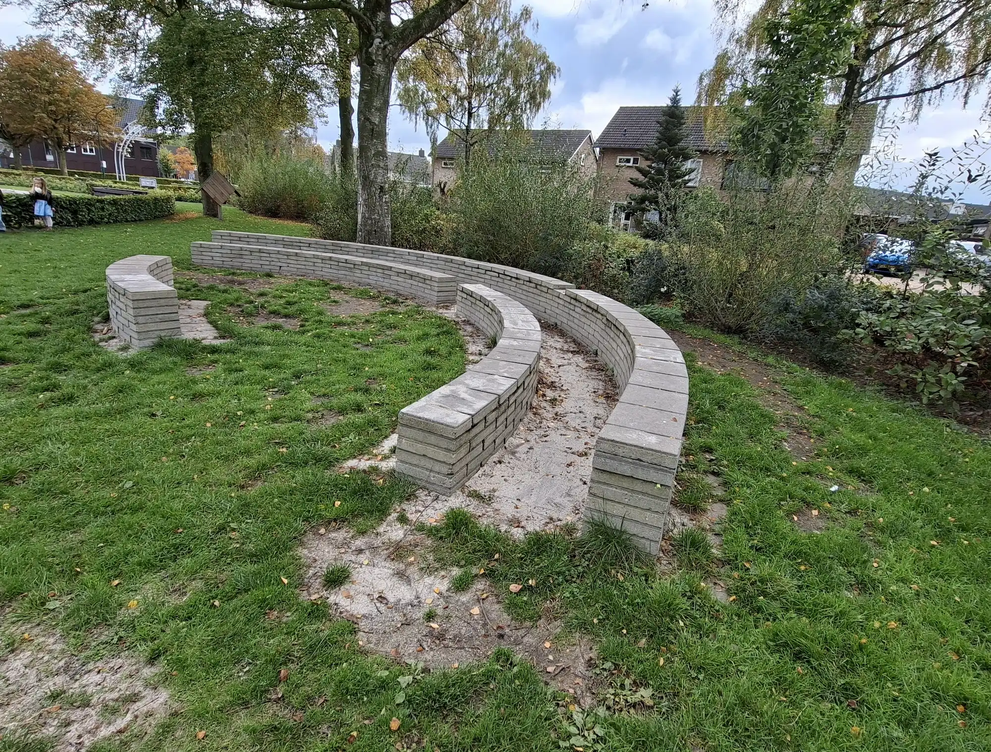 Vanaf het schoolplein van kindcentrum De Sprankel loop je zó een groot, open grasveld op – een plek waar natuur en spel samenkomen. Je vindt er struiken, bomen en gezellige bankjes waar kinderen, ouders en leerkrachten graag even samenkomen.