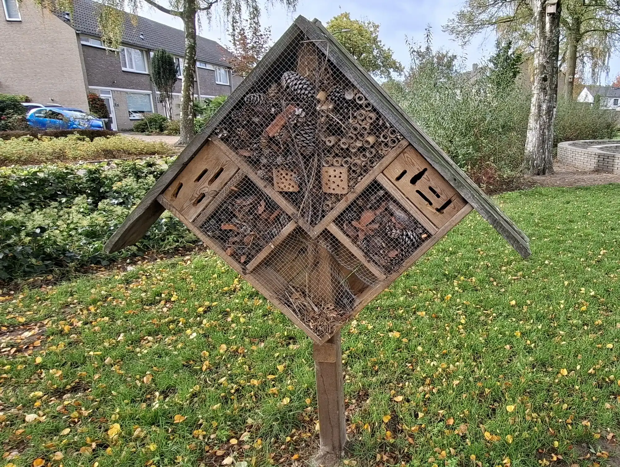 De omgeving is rijk aan leven: een bijenhotel trekt kleine bezoekers aan, en de plantvakken met gevarieerde beplanting zorgen het hele jaar door voor kleur, geur en beweging.