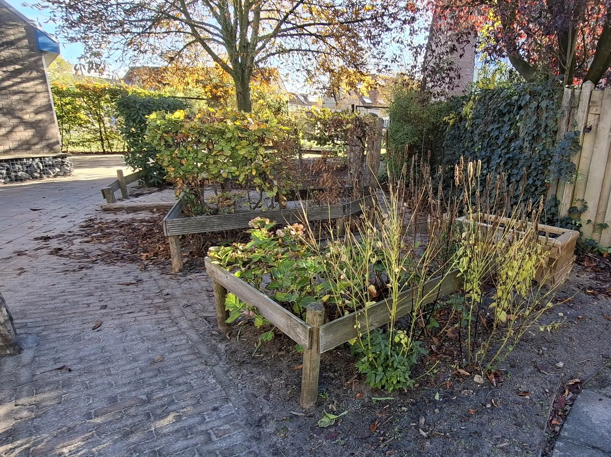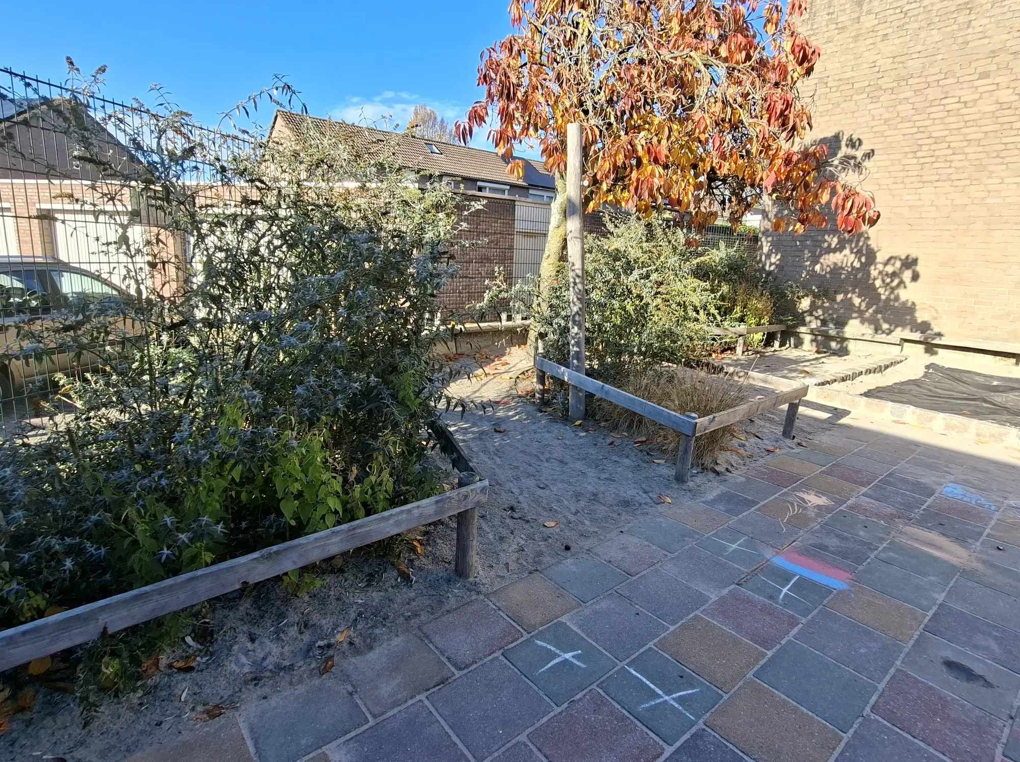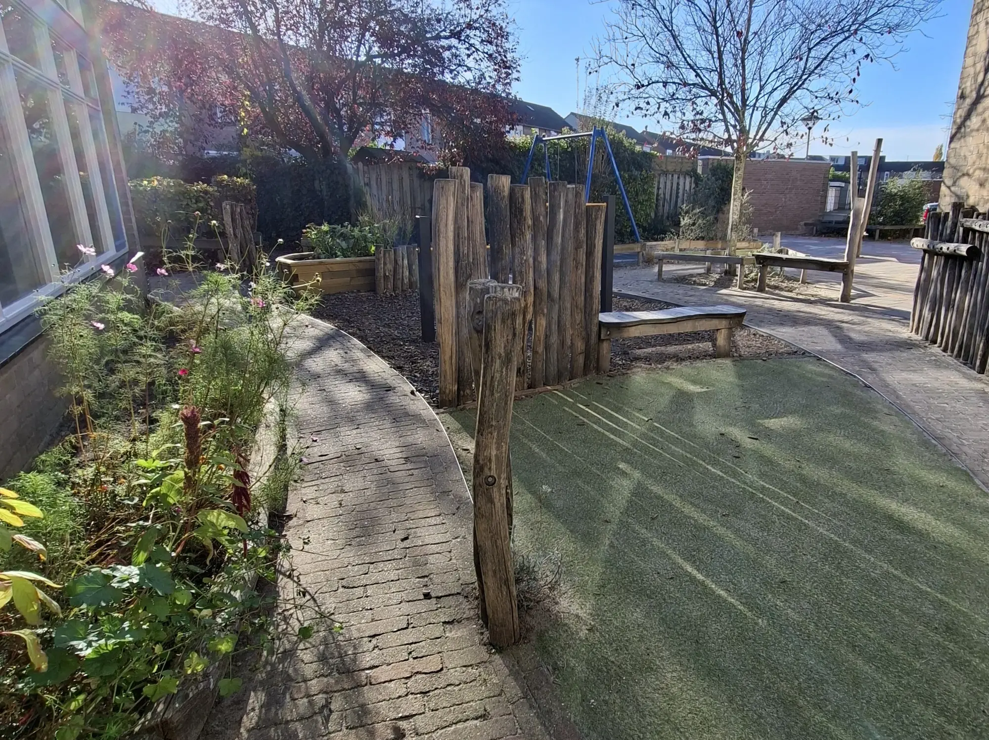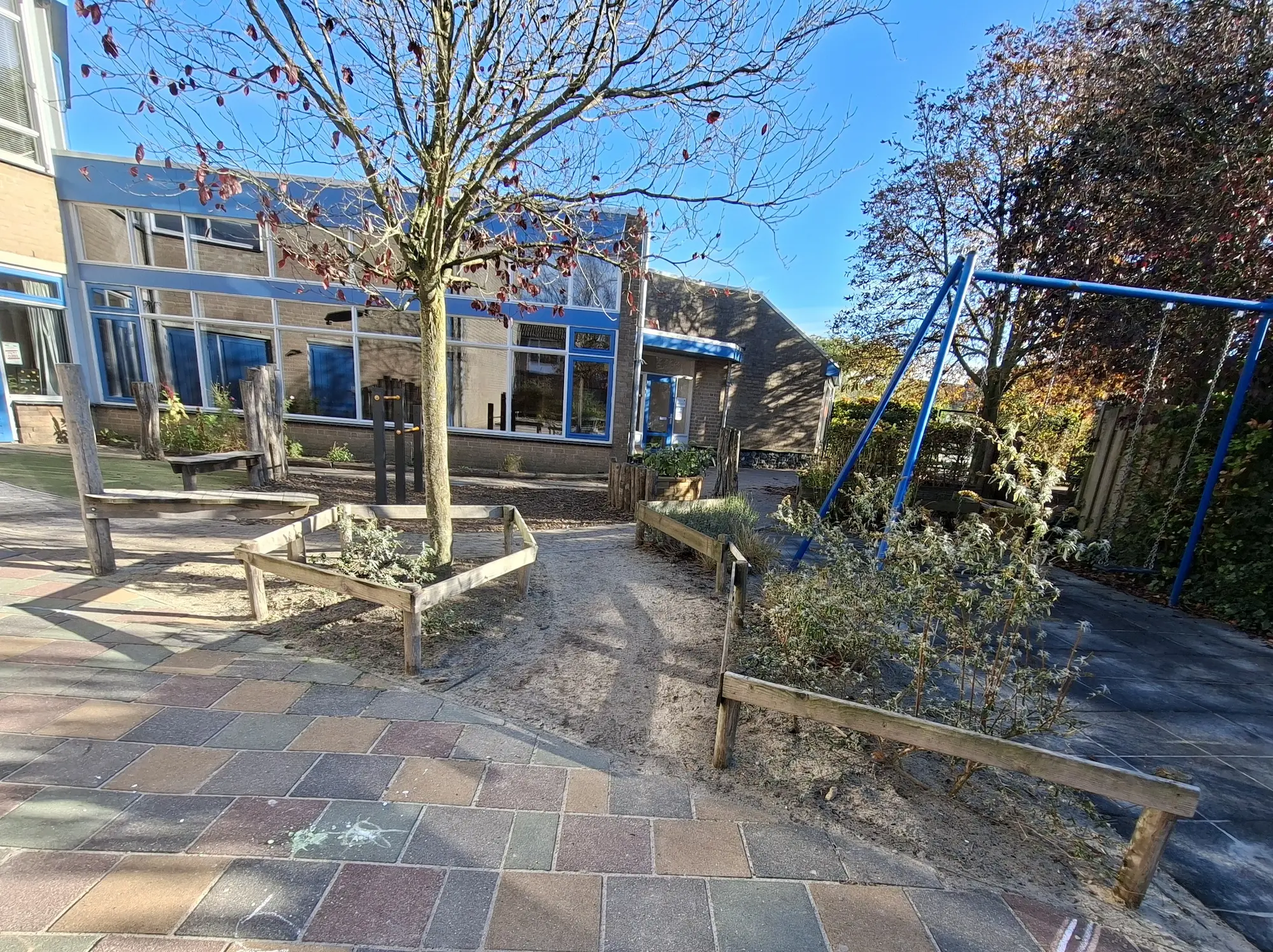 Het plein biedt volop uitdaging en plezier: balanceerstammen, stappaaltjes, een glijbaan en een duikelrek zorgen voor beweging en avontuur. In de moestuinbakken en het geveltuintje ontdekken kinderen hoe planten groeien en hoe leuk het is om samen iets te verzorgen.