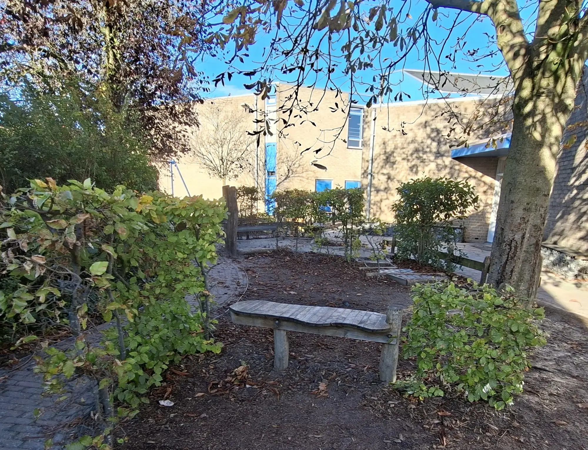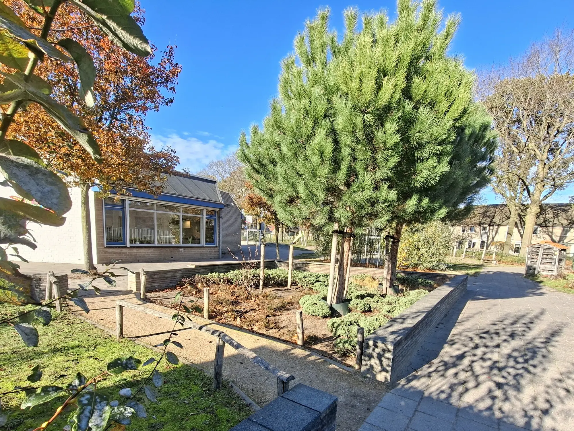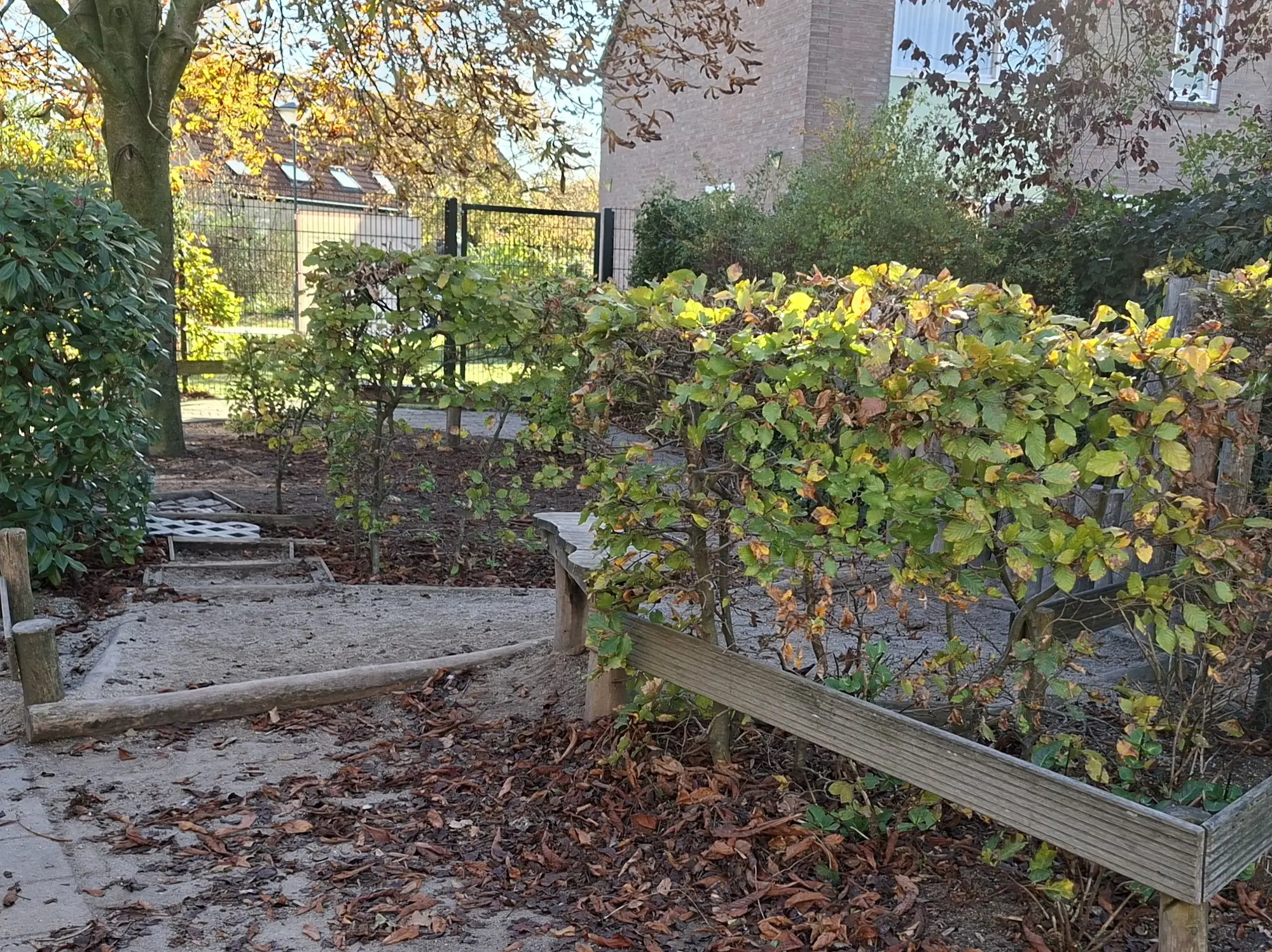 Het plein biedt volop uitdaging en plezier: balanceerstammen, stappaaltjes, een glijbaan en een duikelrek zorgen voor beweging en avontuur. In de moestuinbakken en het geveltuintje ontdekken kinderen hoe planten groeien en hoe leuk het is om samen iets te verzorgen.
