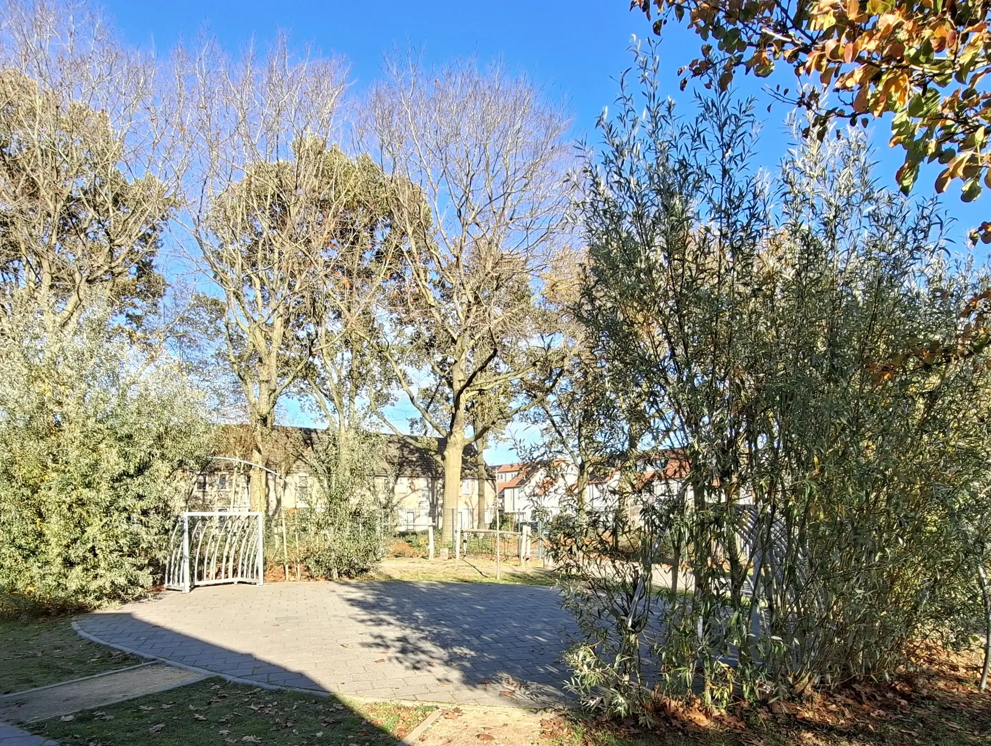 Verderop wordt het plein steeds natuurlijker en avontuurlijker. Overal groeien bomen, hagen en planten, waardoor er een fijne, rustige sfeer ontstaat. De voetbalgoaltjes hebben een slimme, groene omlijsting van struiken die dienen als natuurlijke ballenvangers. Tussen het groen vind je verschillende hoekjes en plekjes waar kinderen kunnen spelen, zich even terugtrekken of gewoon lekker kletsen.