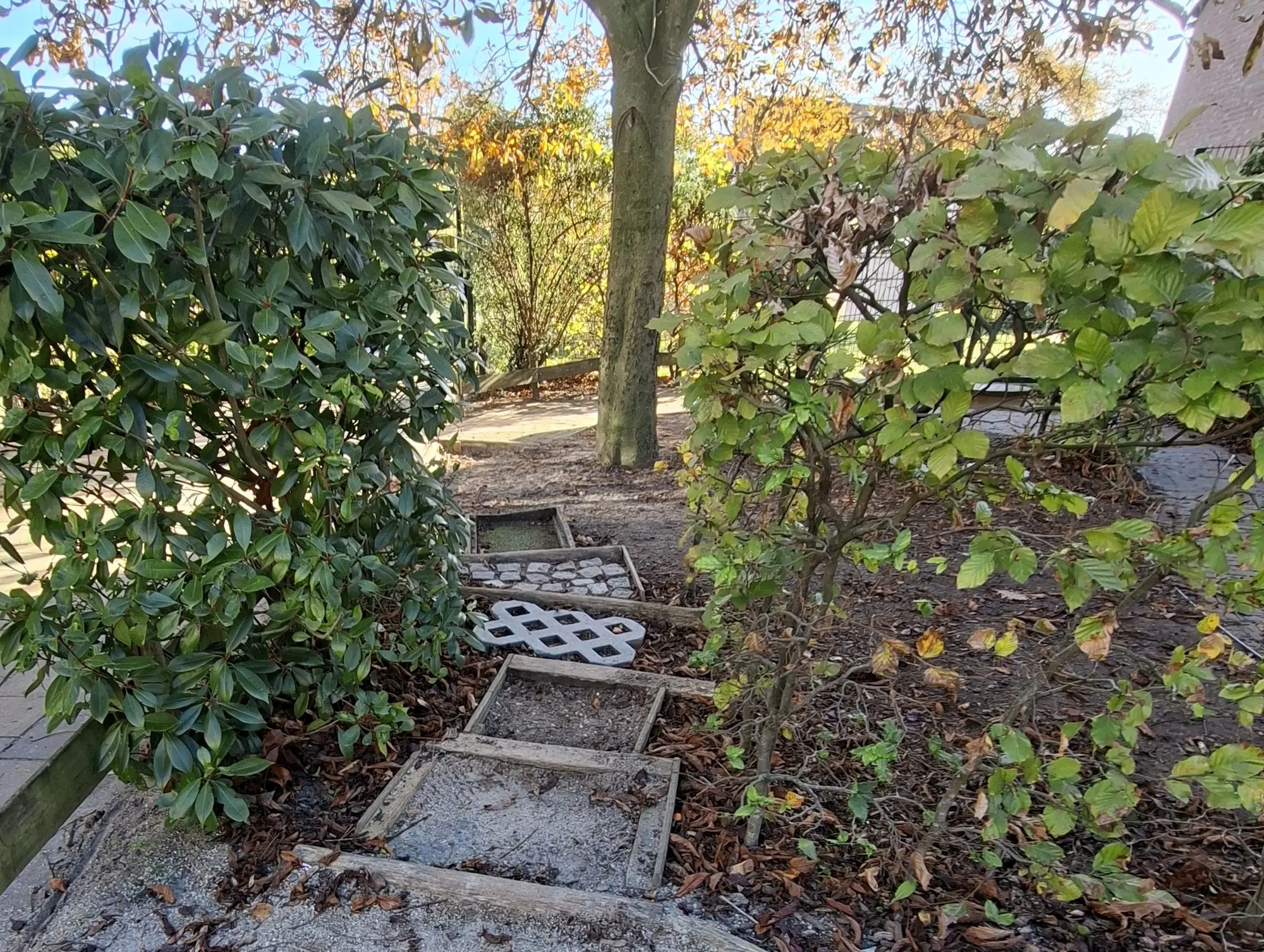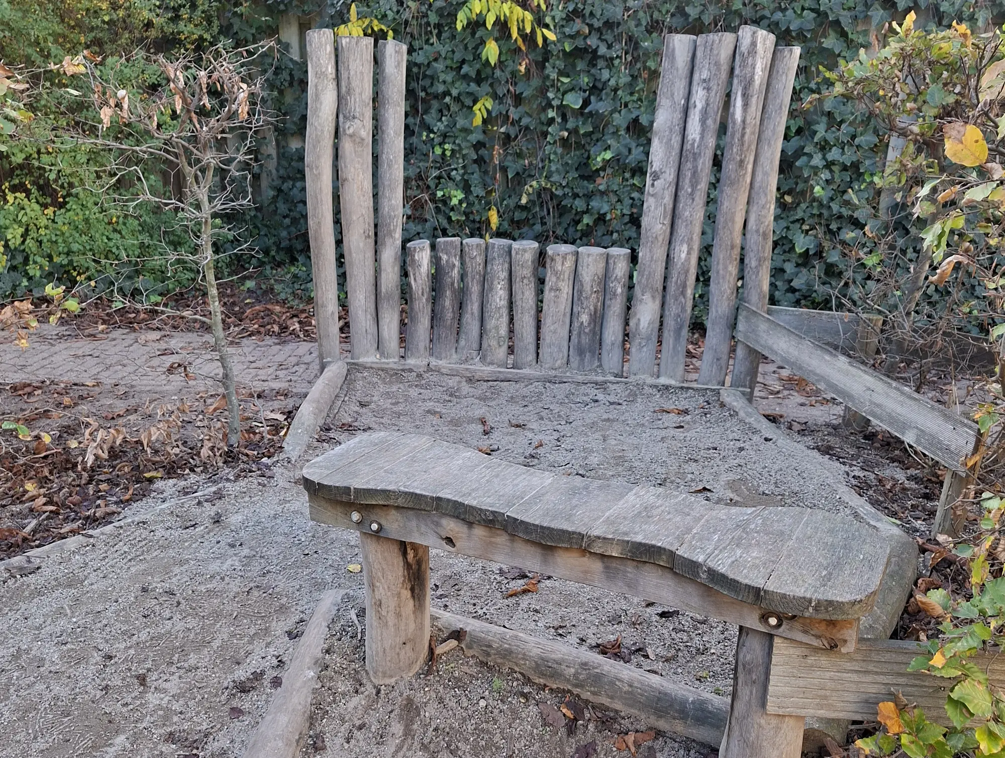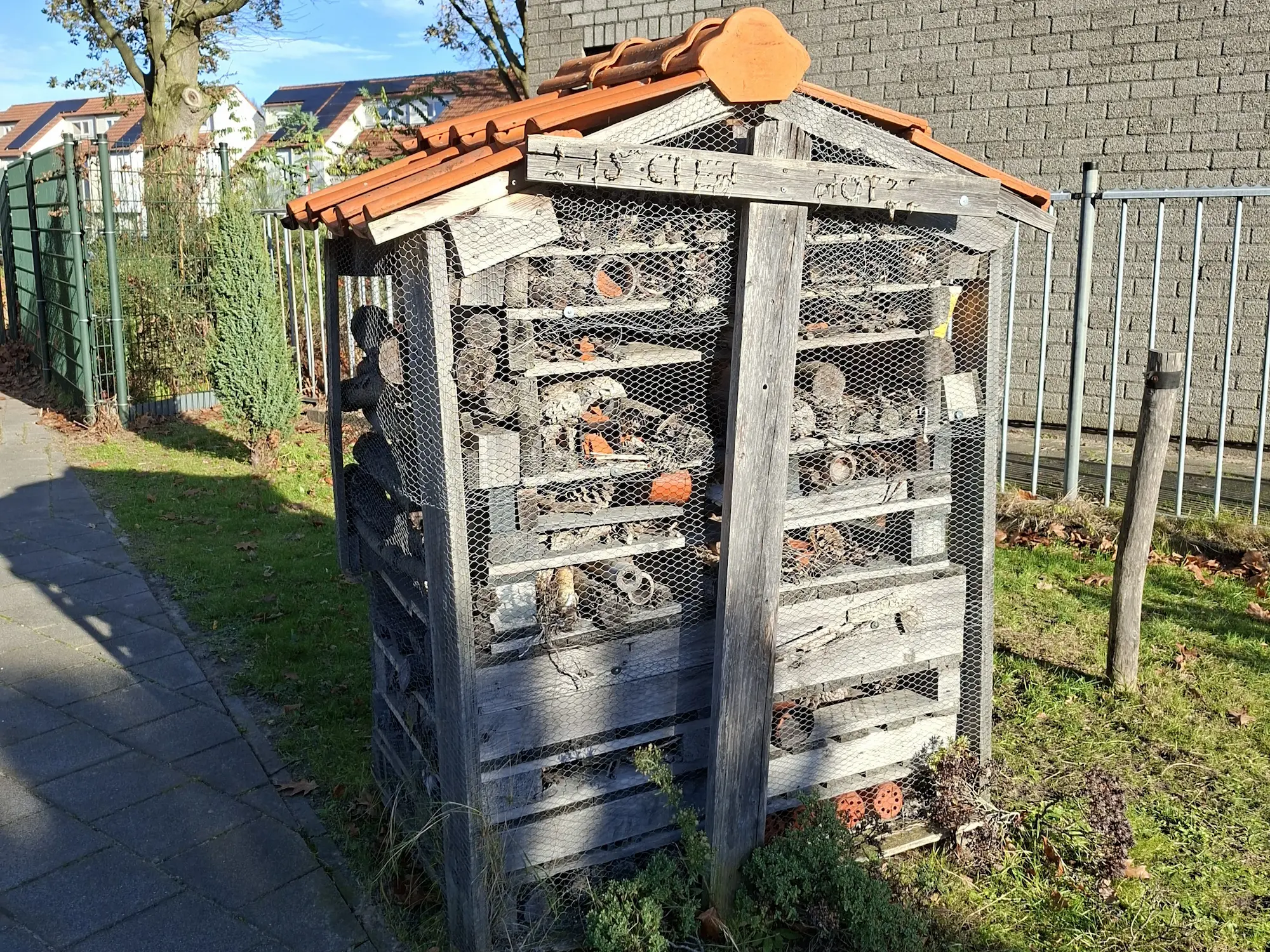 Een groot insectenhotel biedt plek aan allerlei kleine beestjes, terwijl planten en bloemen veilig groeien achter een houten afscheiding van planken. Overal staan bankjes om even uit te rusten of te genieten van alles wat leeft en bloeit.