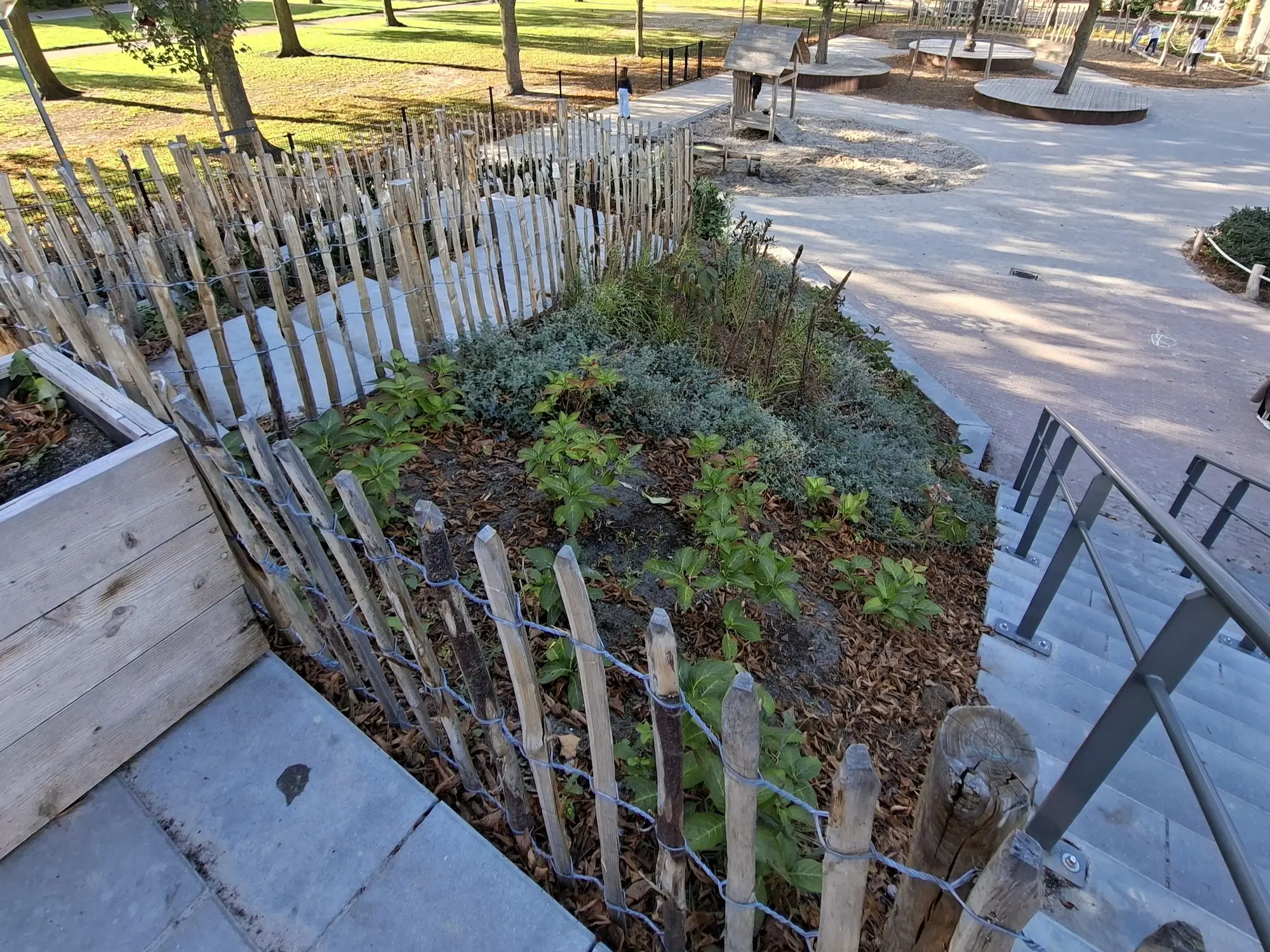 Echte blikvangers zijn de trap en glijbaan vanaf de eerste verdieping – een bijzondere combinatie die meteen de fantasie prikkelt. De trap en glijbaan zijn omringd door vakken met vaste planten, waardoor het geheel mooi opgaat in het groen.