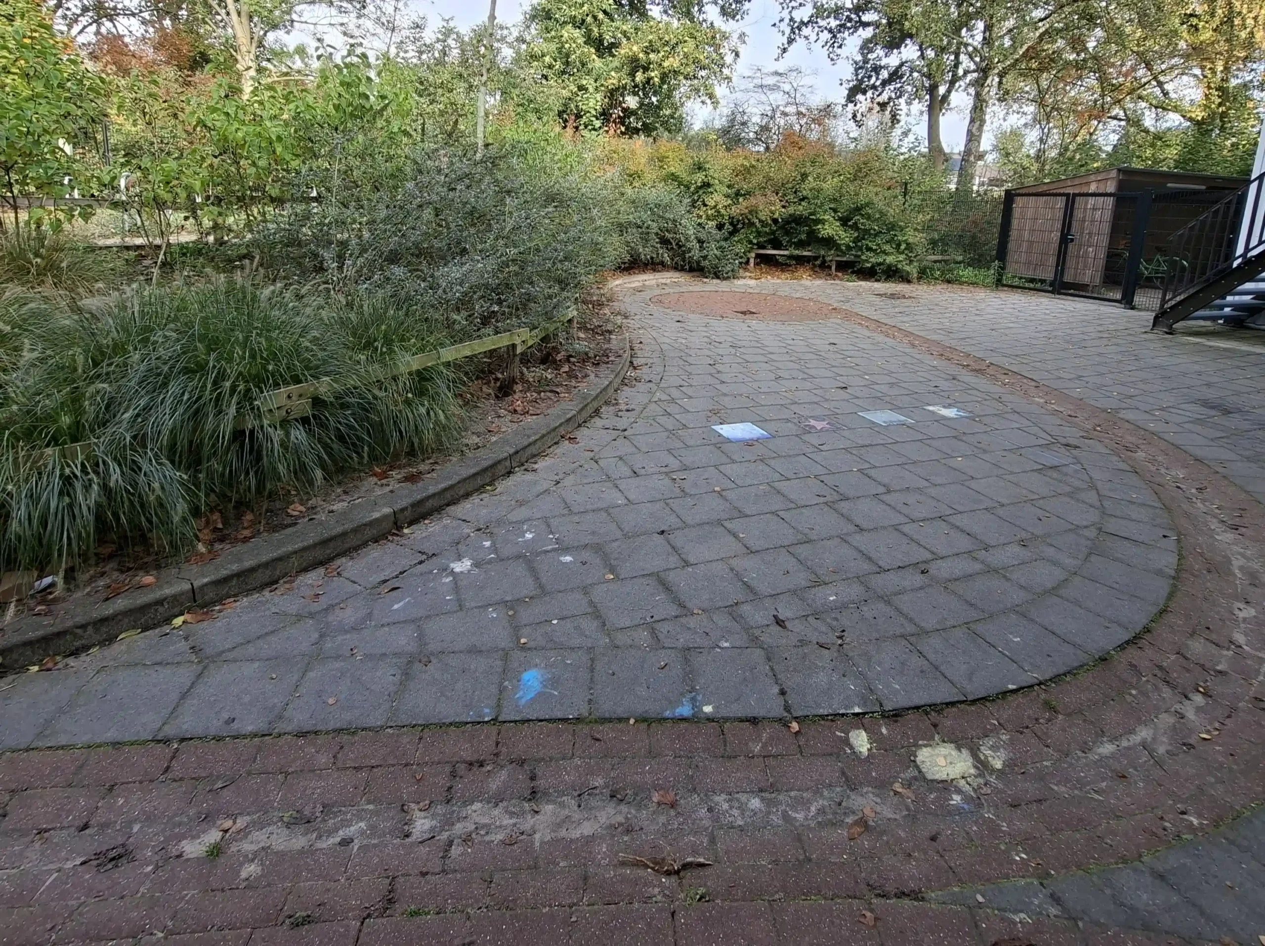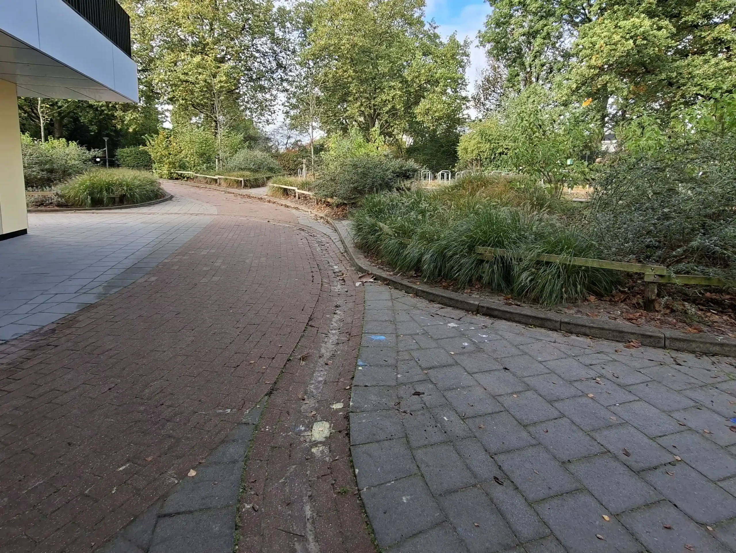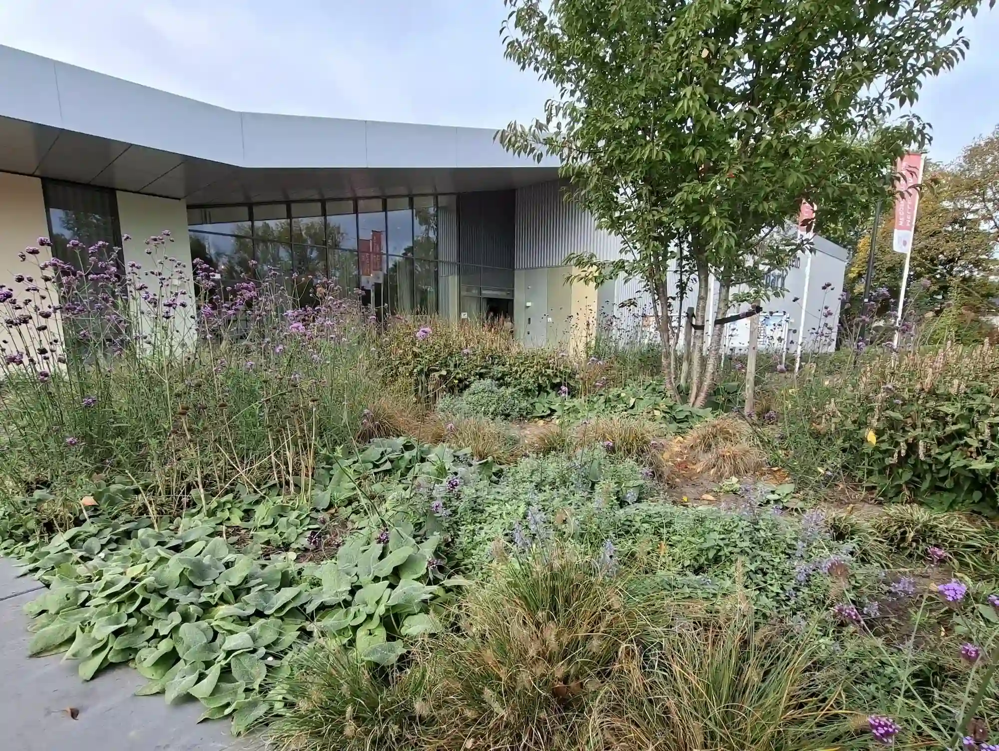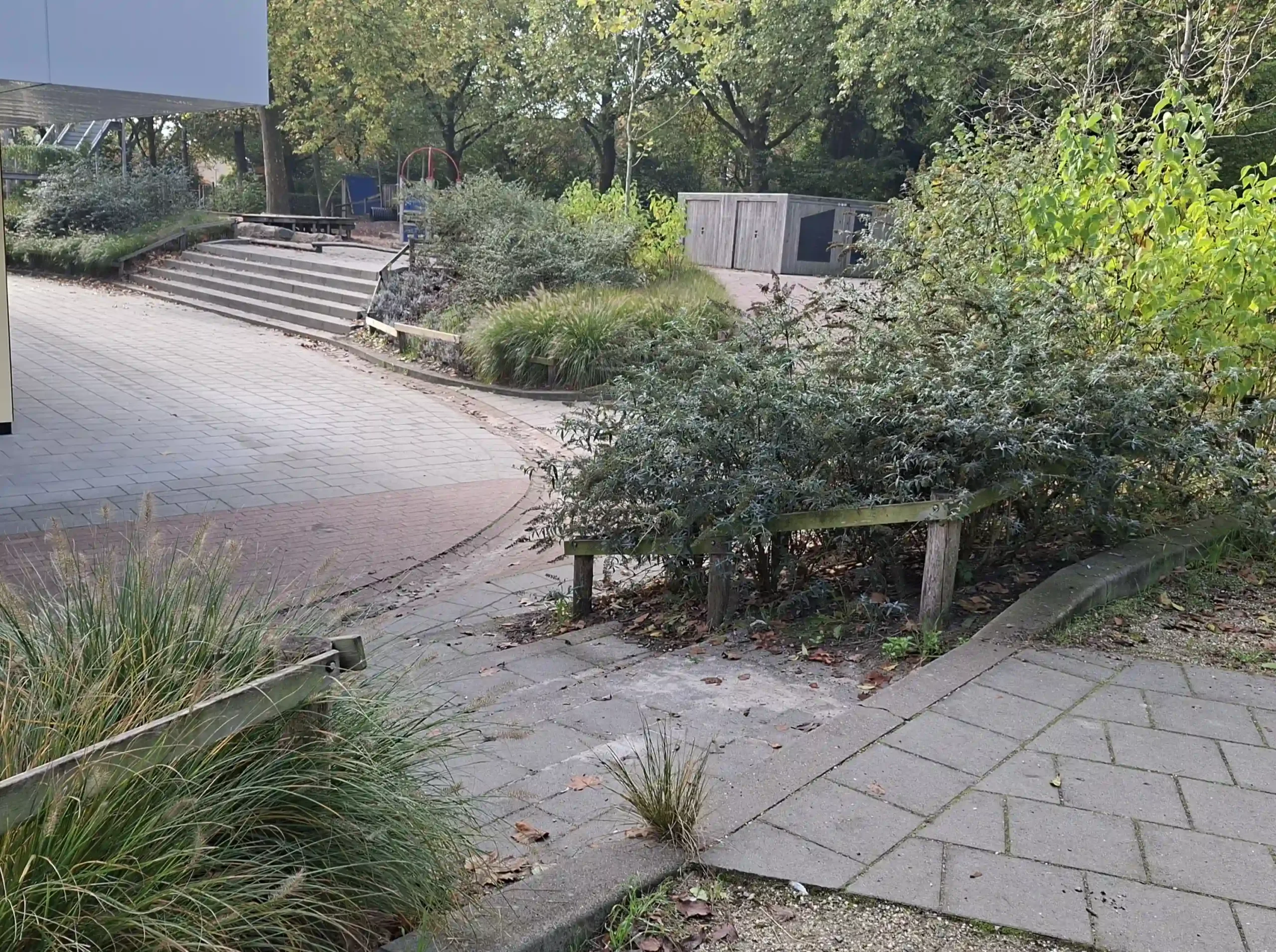 De grote bomen zorgen voor heerlijke schaduw en een prettige sfeer. Overal zie je klimaatslimme en natuurslimme oplossingen: regenwater wordt opgevangen in gootjes, de fietsenstalling heeft halfverharding, en de buitentrap is begroeid met groen. De natuurlijke ondergrond zorgt ervoor dat het regenwater rustig in de bodem zakt, wat het plein duurzaam en aangenaam maakt – zelfs op warme dagen.
