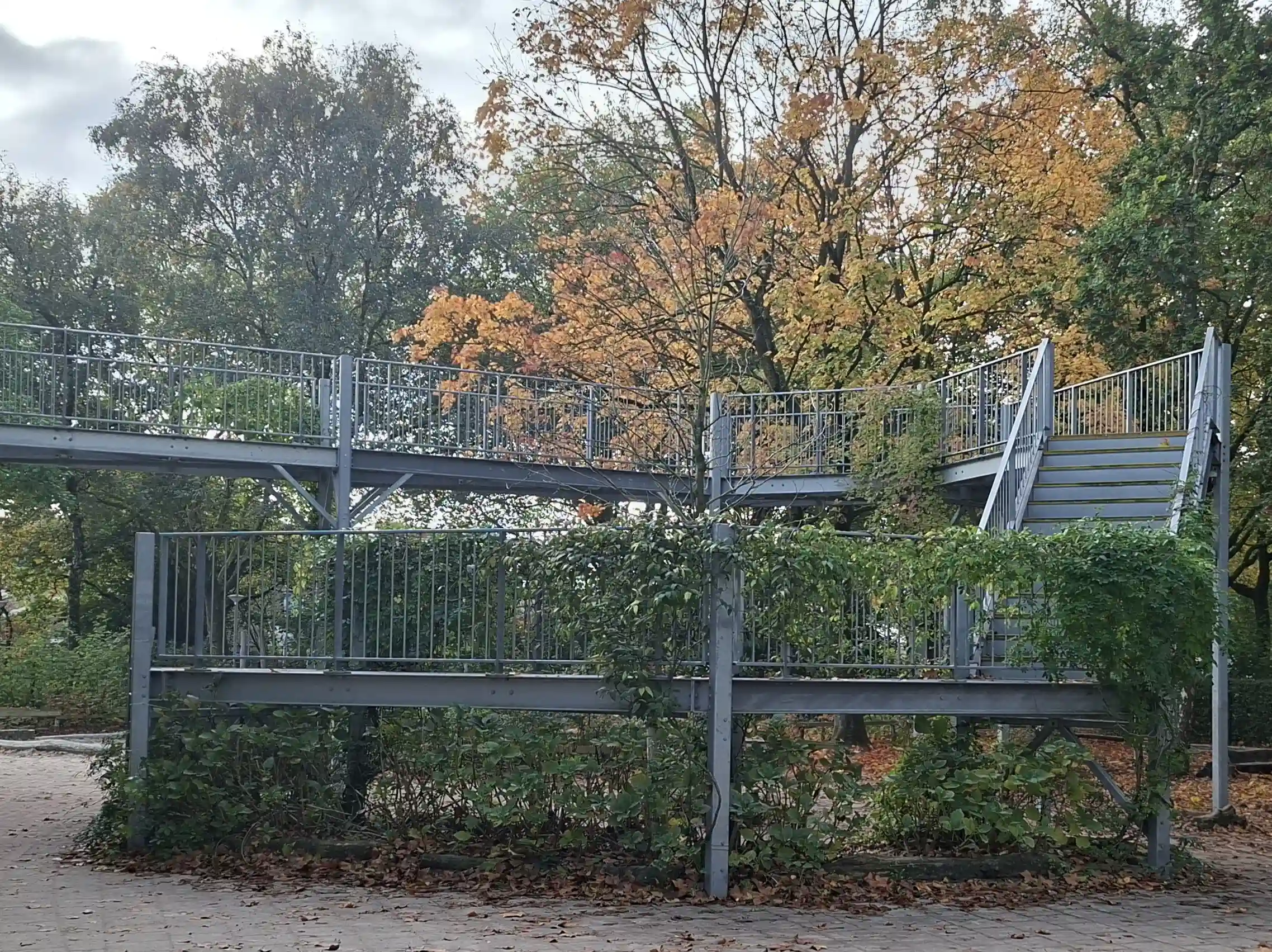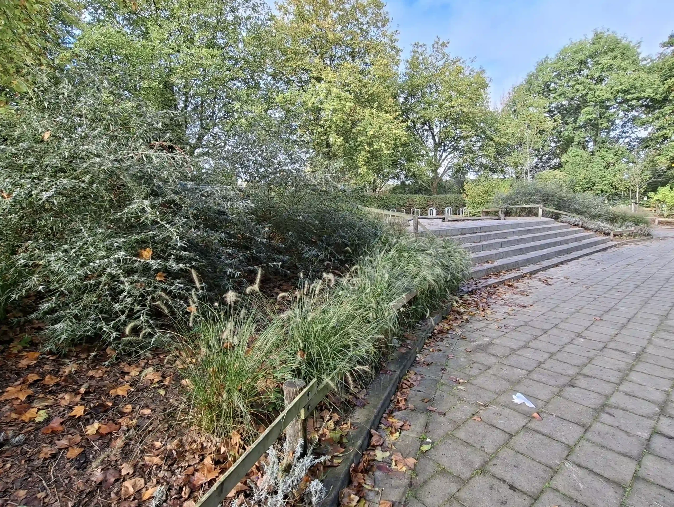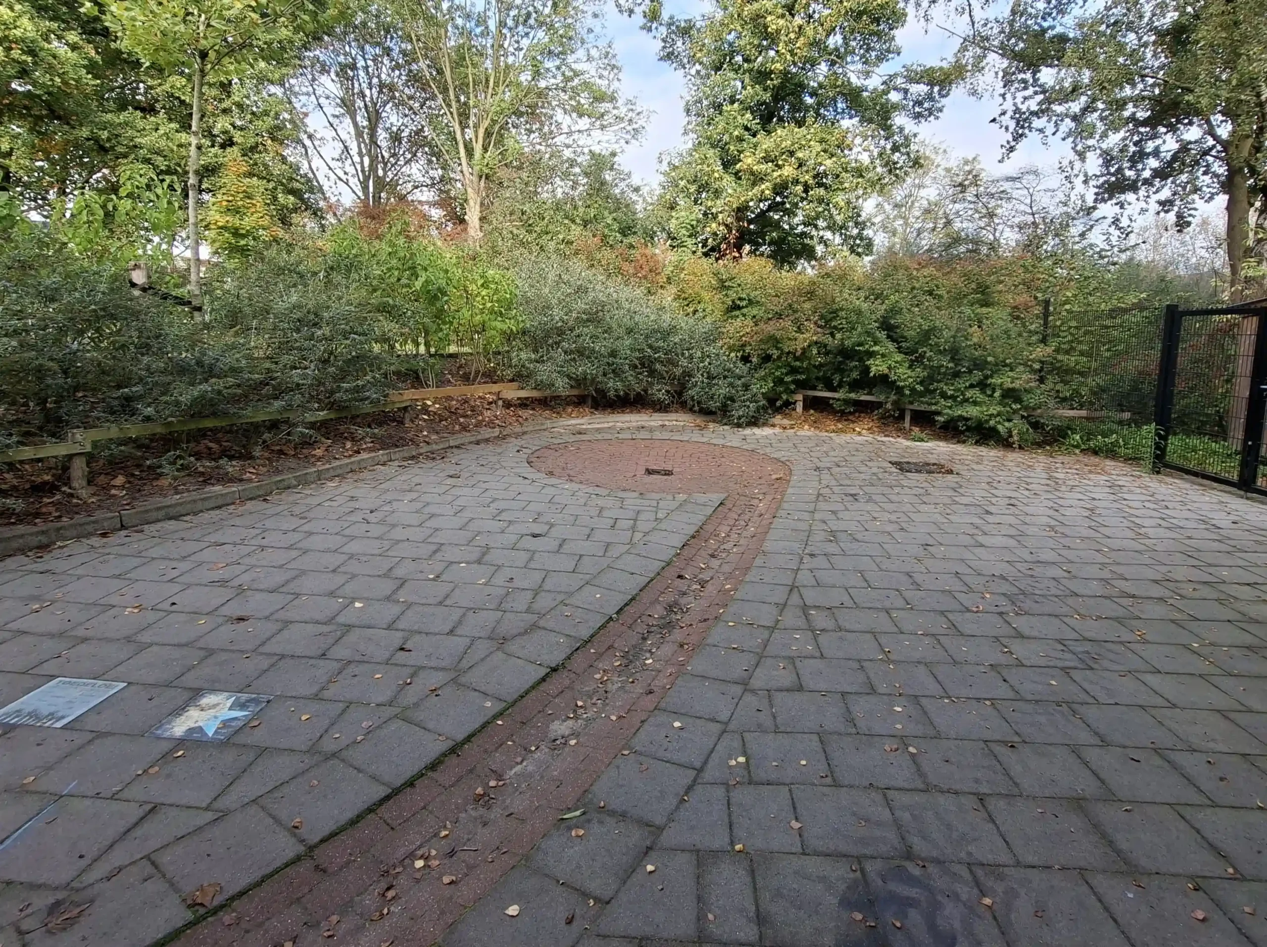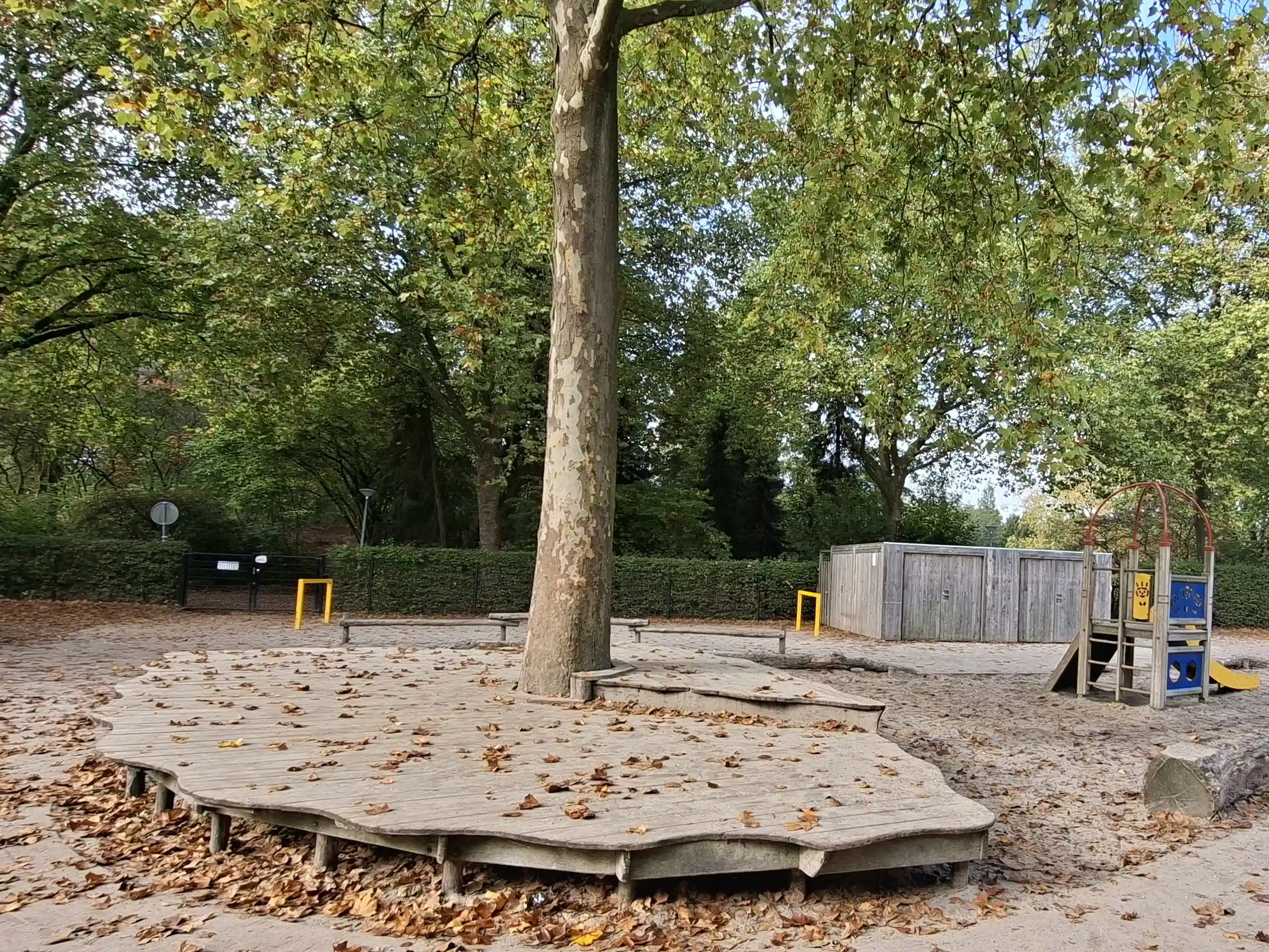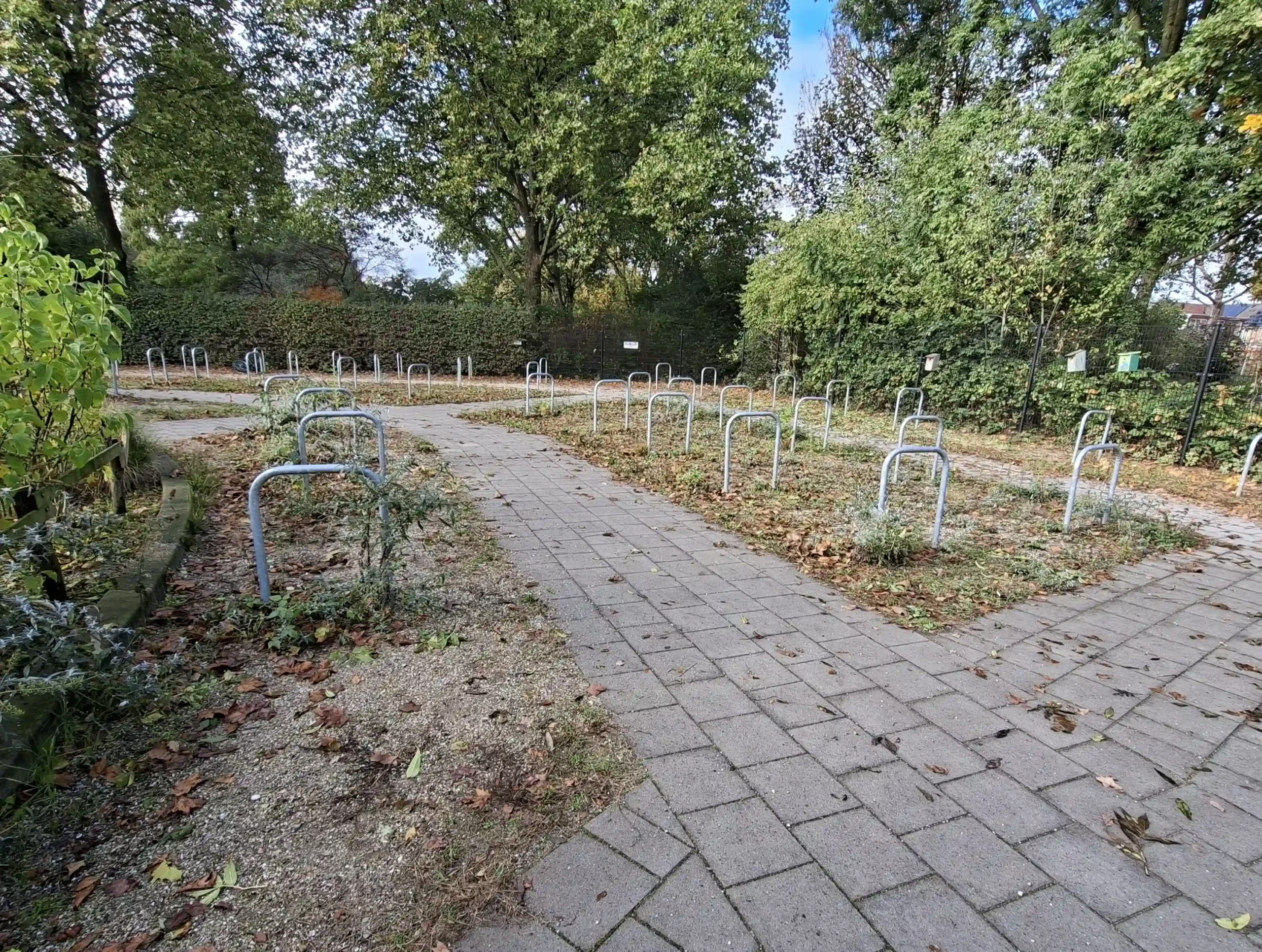 De grote bomen zorgen voor heerlijke schaduw en een prettige sfeer. Overal zie je klimaatslimme en natuurslimme oplossingen: regenwater wordt opgevangen in gootjes, de fietsenstalling heeft halfverharding, en de buitentrap is begroeid met groen. De natuurlijke ondergrond zorgt ervoor dat het regenwater rustig in de bodem zakt, wat het plein duurzaam en aangenaam maakt – zelfs op warme dagen.