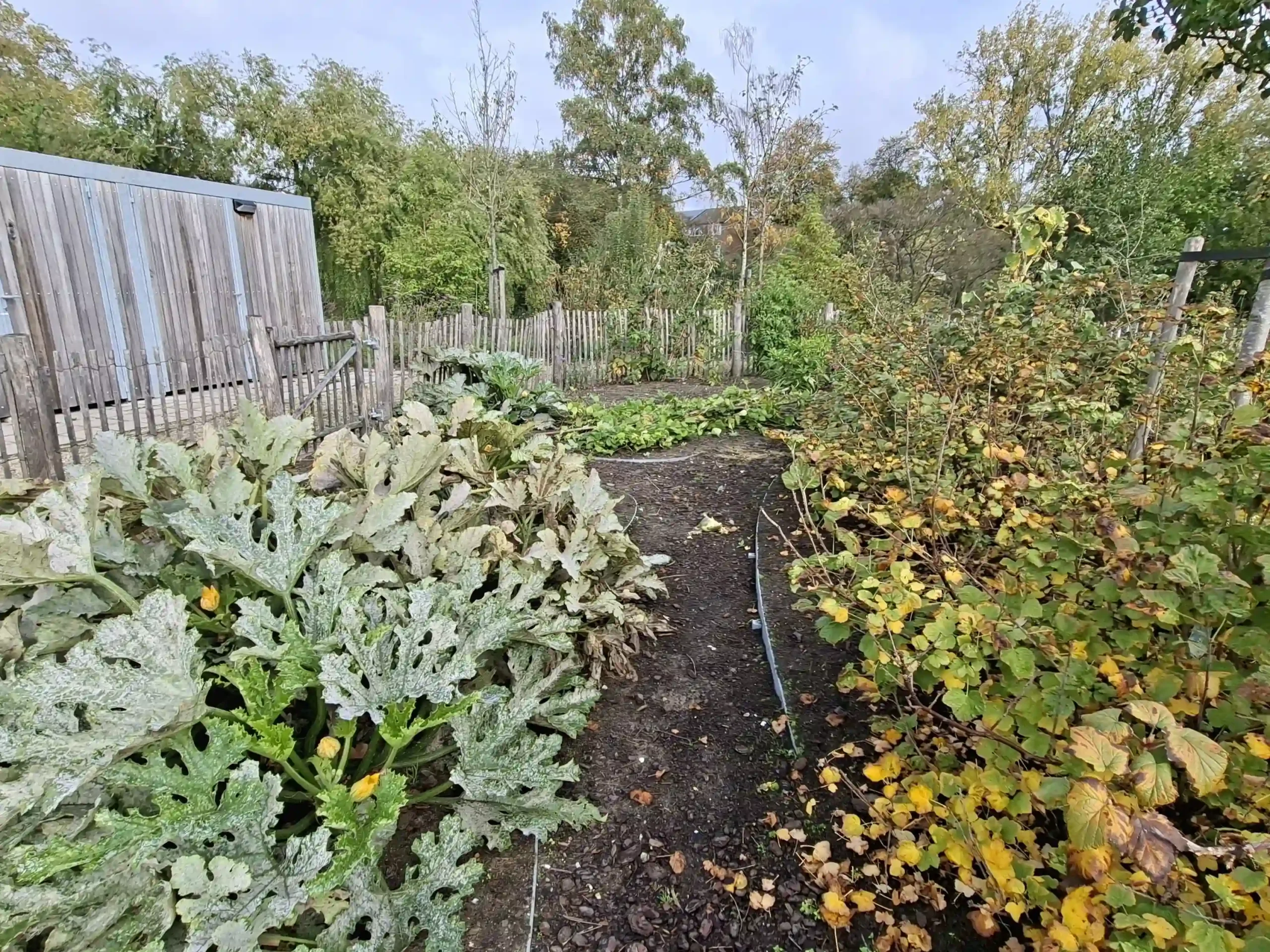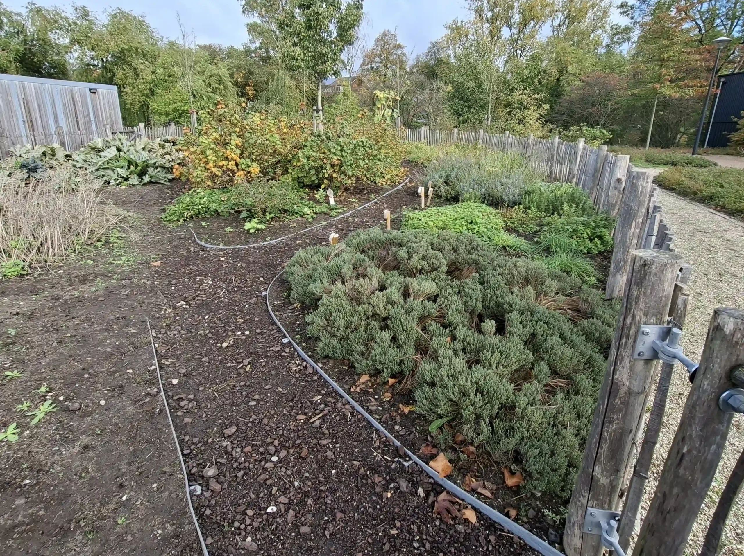 Aan de andere kant van het gebouw ligt een prachtige moestuin, waar kinderen kunnen zaaien, oogsten en leren over groei en gezond eten.