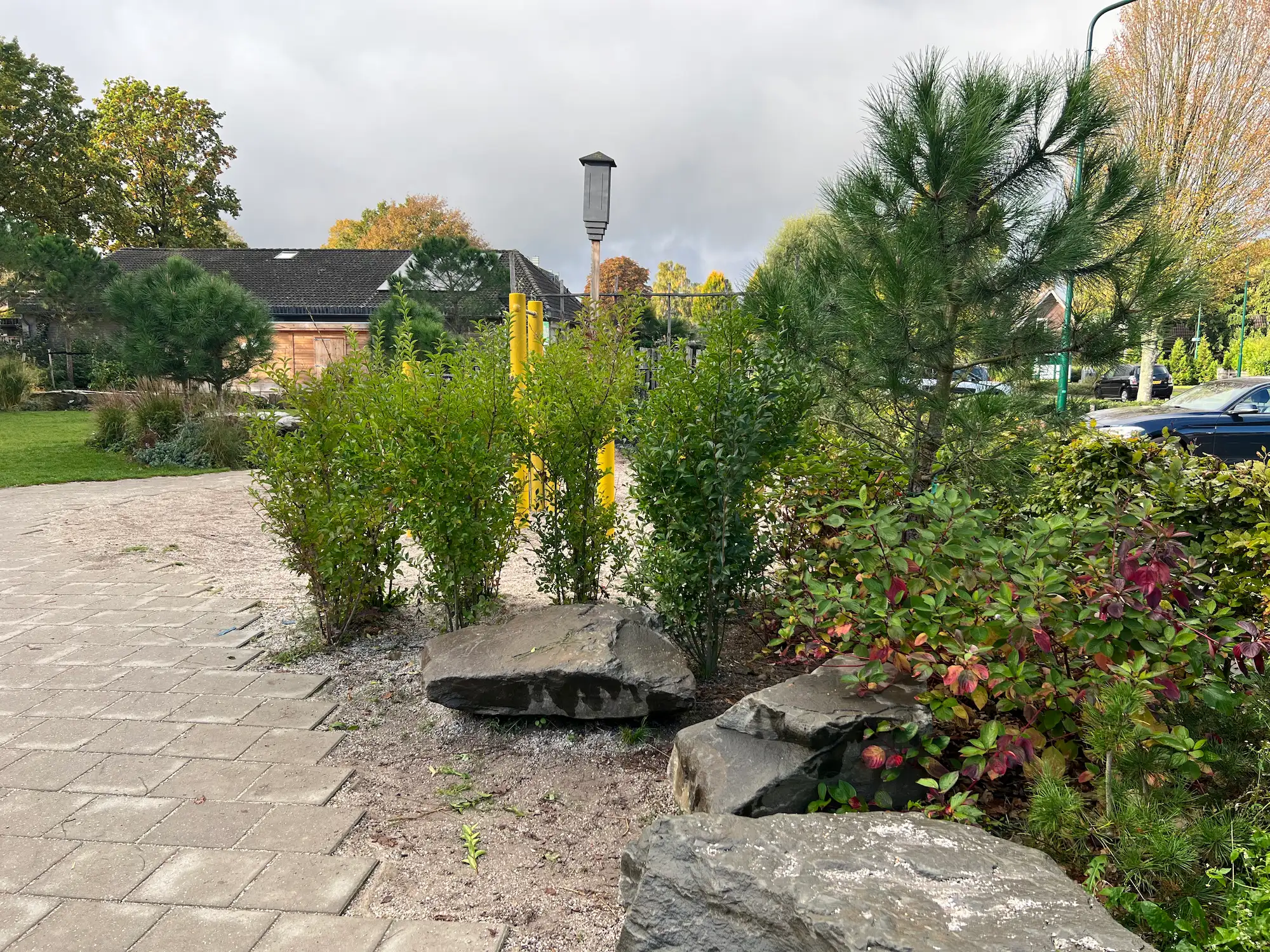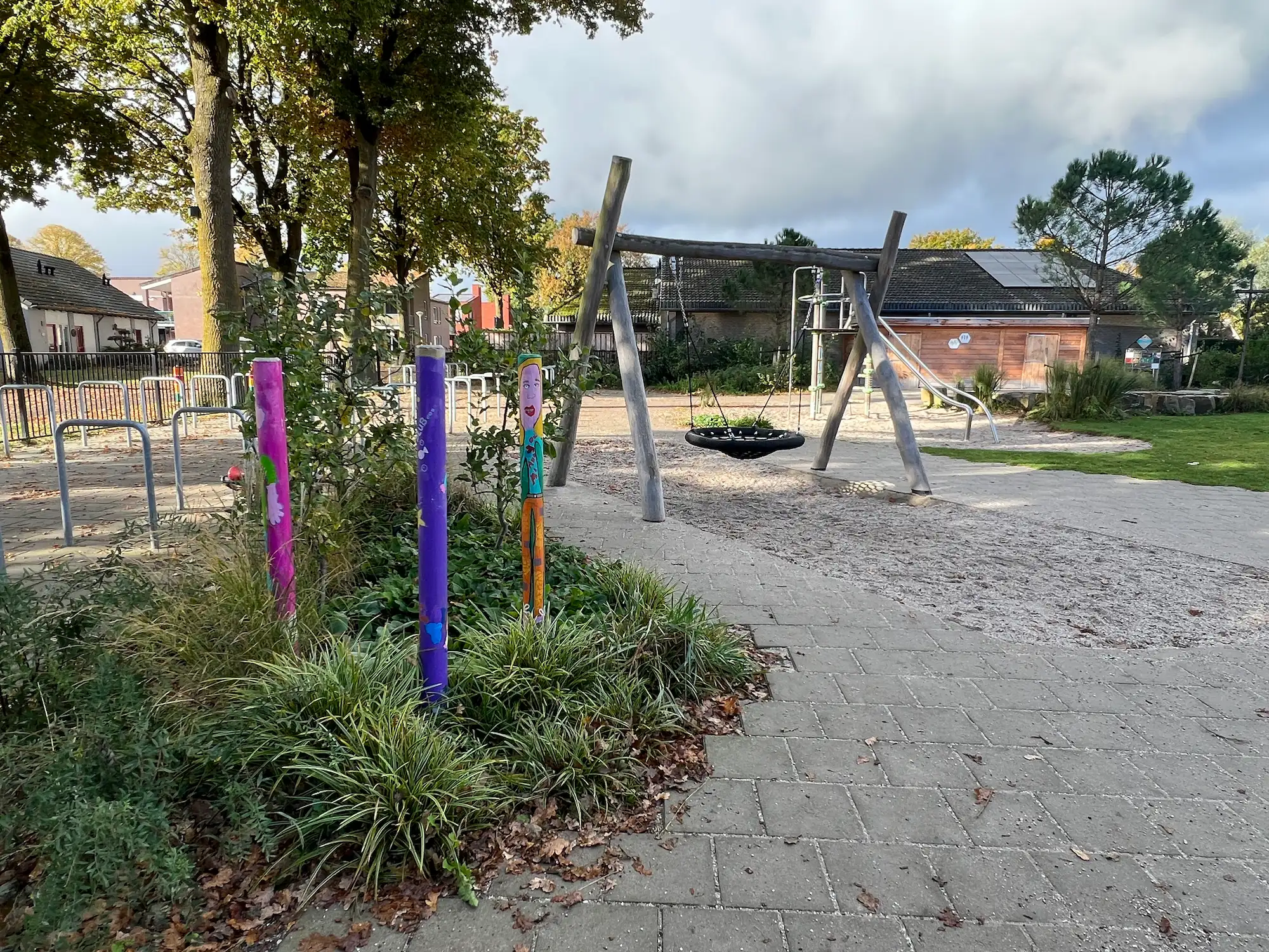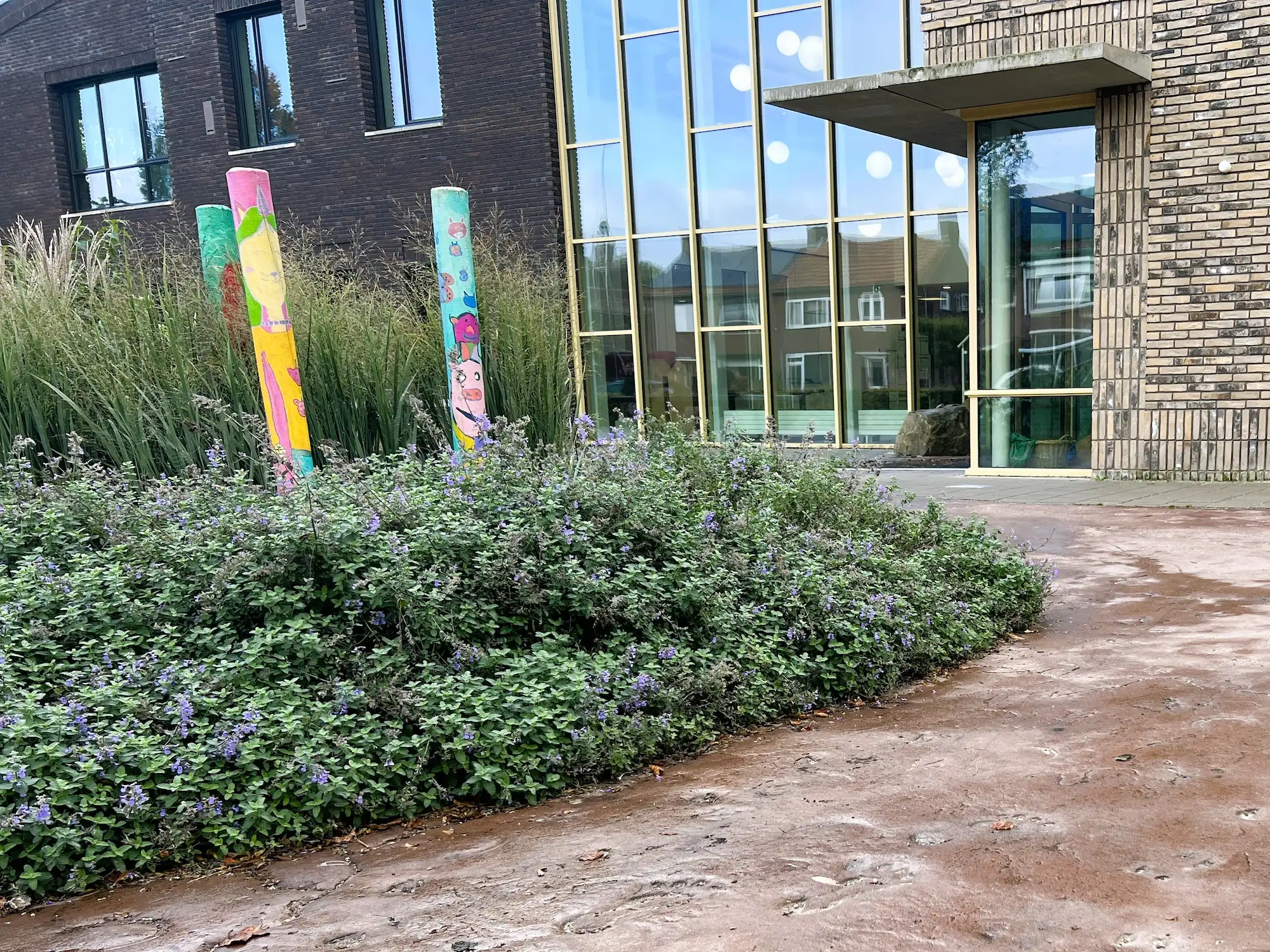 De variatie aan bomen, struiken en planten zorgt het hele jaar door voor kleur en leven. Omdat veel van deze planten ook in de winter groen blijven, behoudt het plein zelfs op koude dagen zijn frisse, natuurlijke uitstraling. Extra vrolijk detail: de houten palen die door de leerlingen zelf zijn beschilderd geven het plein een persoonlijk en kleurrijk karakter.