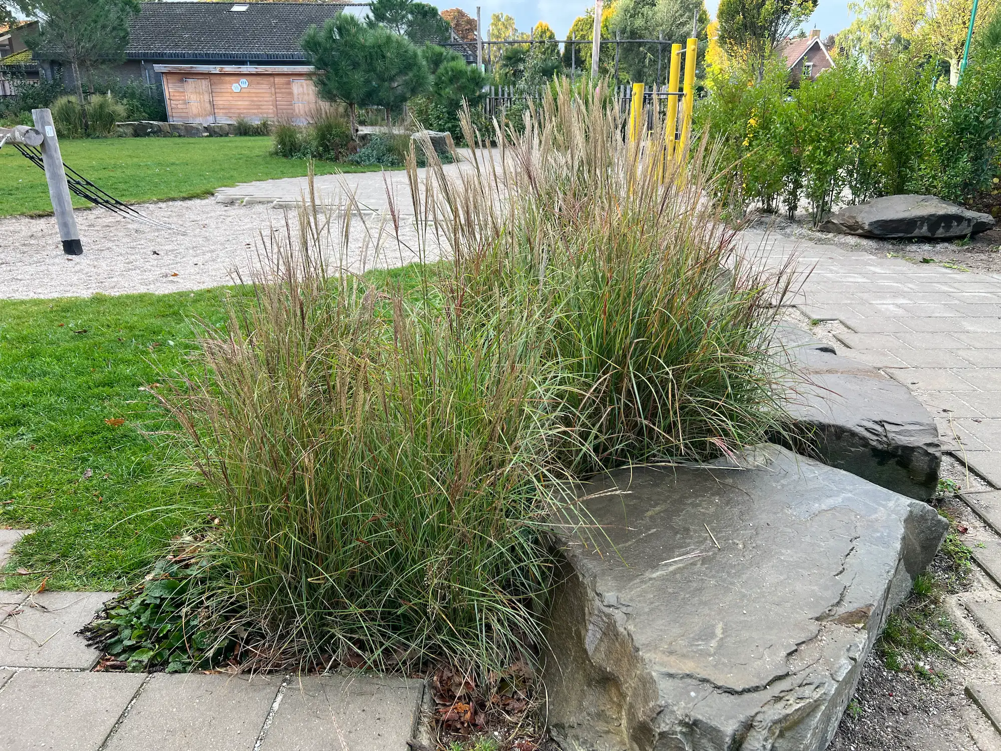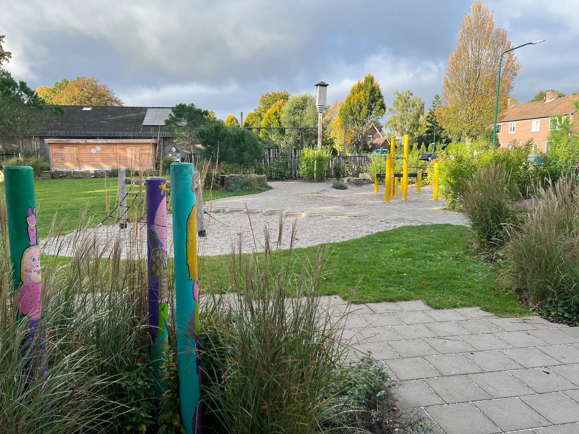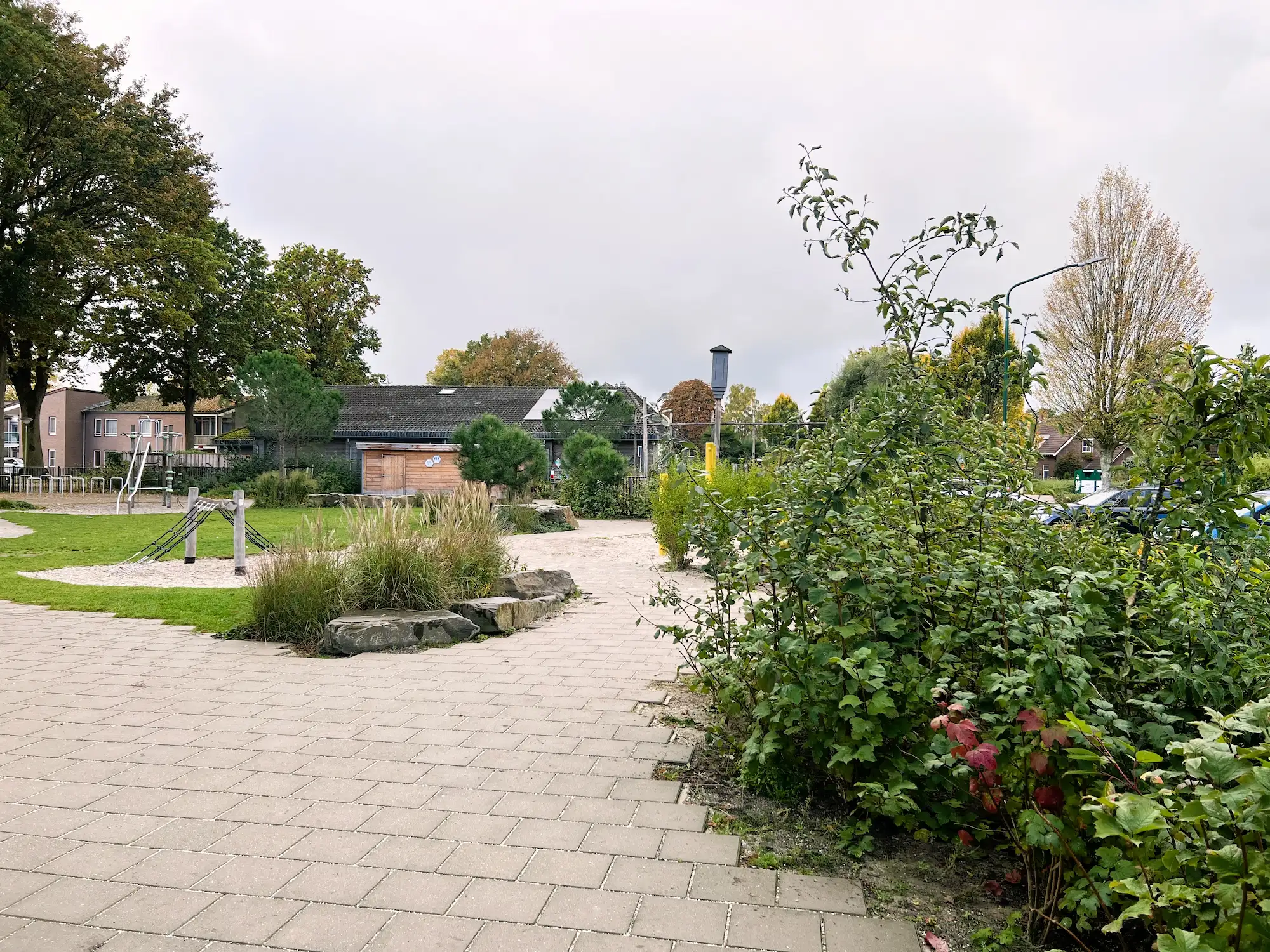 De variatie aan bomen, struiken en planten zorgt het hele jaar door voor kleur en leven. Omdat veel van deze planten ook in de winter groen blijven, behoudt het plein zelfs op koude dagen zijn frisse, natuurlijke uitstraling. Extra vrolijk detail: de houten palen die door de leerlingen zelf zijn beschilderd geven het plein een persoonlijk en kleurrijk karakter.